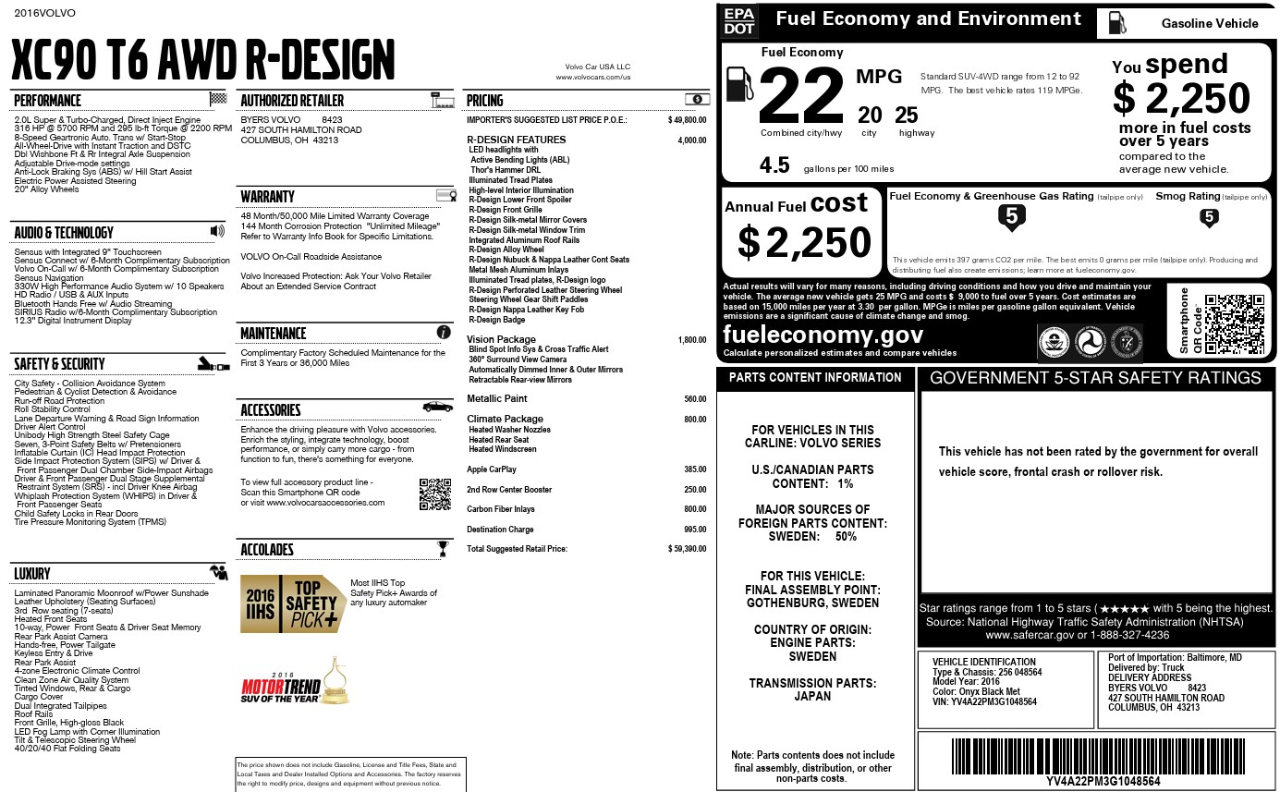 IN ON TRADE AND PRICED TO GO * 7-PASSENGER XC90 AWD T6 R-DESIGN * CLEAN CARFAX * TIMING BELT REPLACED, COOLANT FLUSH, AND NEW BATTERY LESS THAN 5K MILES AGO * OIL CHANGE DONE 600 MILES AGO * IIHS TOP SAFETY PICK * MOTORTREND SUV OF THE YEAR * $59,390 ORIGINAL STICKER * VISION PKG $1,800 * BLIND SPOT INFO AND CROSS TRAFFIC ALERT * 360 SURROUND VIEW CAMERA * REAR PARK ASSIST * LANE DEPARTURE WARNING & ROAD SIGN INFO * AUTO-DIM INTERIOR AND EXTERIOR MIRRORS * SENSUS WITH 9" TOUCHSCREEN WITH NAVIGATION AND SENSUS CONNECT * APPLE CARPLAY $385 * 10-SPEAKER HIGH PERFORMANCEAUDIO WITH SAT/HD/USB/AUX * BLUETOOTH * PANORAMIC POWER GLASS SUNROOF WITH POWER SHADE * R-DESIGN PKG $4,000 * R-DESIGN NUBUCK AND NAPPA LEATHER CONTOUR HEATED POWER SEATS * R-DESIGN ADJUSTABLE PERFORATED NAPPA LEATHER WHEEL WITH SHIFT PADDLES * 40/20/40 FOLD-FLAT 2ND ROW SEATS * FOLD-FLAT 3RD ROW SEATS * 20" R-DESIGN ALLOYS * LED HEADLIGHTS WITH ACTIVE BENDING * THOR'S HAMMER DRL'S * HIGH LEVEL INTERIOR ILLUMINATION * ILLUMINTED R-DESIGN TREAD PLATES * R-DESIGN FRONT SPOILER, FRONT GRILLE, SILK METAL MIRROR COVERS AND WINDOW TRIM * INTEGRATED ALUMINUM ROOF RAILS * 4-ZONE CLIMATE CONTROL * CLIMATE PKG $800 * HEATED REAR SEATS * HEATED WASHER NOZZLES AND WINDSHIELD * KEYLESS ENTRY AND DRIVE * 12.3" INSTRUMENT DISPLAY * HANDS-FREE POWER TAILGATE * CARBON FIBER INLAYS $800 * 2ND ROW CENTER BOOSTER $250 * RETRACTABLE MIRORS * 2.0L SUPER AND TURBO-CHARGED 4 CYL ENGINE WITH 316 HP AND 295 LB-FT TORQUE * 8-SPEED AUTOMATIC TRANSMISSION * ALL-WHEEL DRIVE WITH INSTANT TRACTION AND DSTC * ADJUSTABLE DRIVE MODE SETTINGS * ONYX BLACK METALLIC $560 * VOLVO ON-CALL * CITY SAFETY COLLISION AVOIDANCE * PEDESTRIAN AND CYCLIST DETECTION AND AVOIDANCE * RUN OFF ROAD PROTECTION * ROLL STABILITY CONTROL * DUAL FRONT, DRIVER KNEE, DUAL SIDE, AND SIDE HEAD IMPACT AIRBAGS * FLOOR MATS * BOOKS * BEST DEAL IN THE COUNTRY *